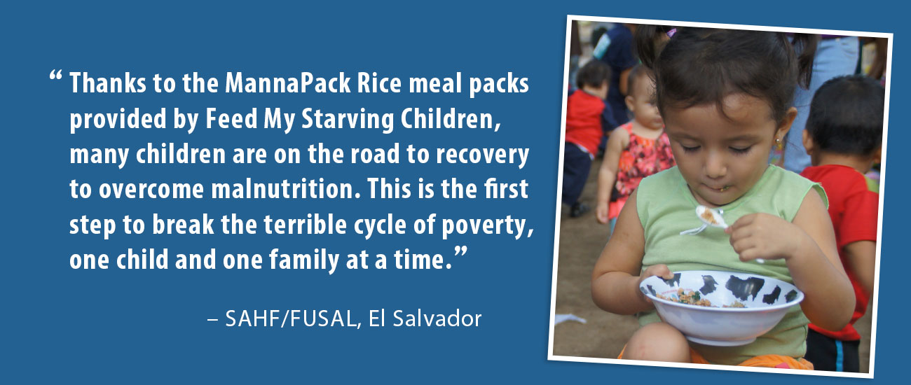 “Thanks to the MannaPack Rice meal packs provided by Feed My Starving Children, many children are on the road to recovery to overcome malnutrition. This is the first step to break the terrible cycle of poverty, one child and one family at a time.” – SAHF/FUSAL, El Salvador
