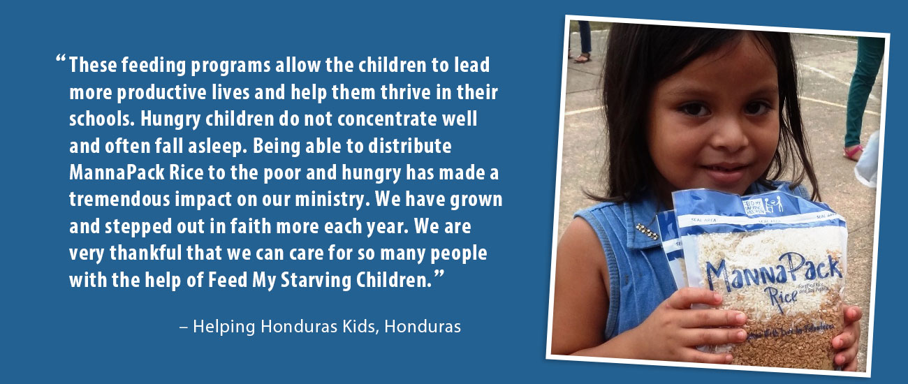 “These feeding programs allow the children to lead more productive lives and help them thrive in their schools. Hungry children do not concentrate well and often fall asleep. Being able to distribute MannaPack Rice to the poor and hungry has made a tremendous impact on our ministry. We have grown and stepped out in faith more each year. We are very thankful that we can care for so many people with the help of Feed My Starving Children.” – Helping Honduras Kids, Honduras